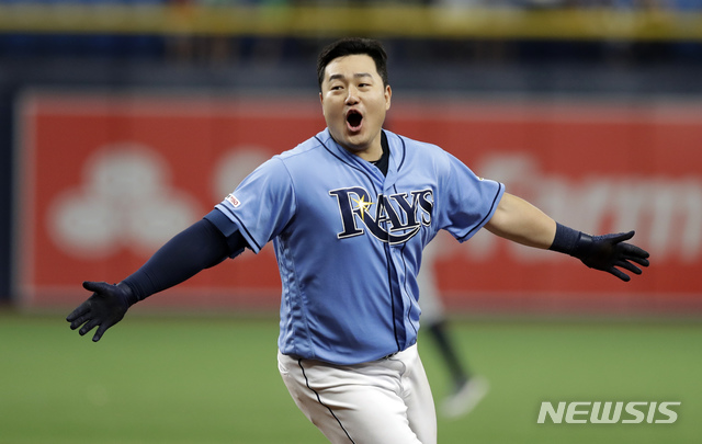 【세인트피터즈버그=AP/뉴시스】탬파베이 레이스의 최지만이 18일(현지시간) 미 플로리다주 세인트피터즈버그 트로피카나 필드에서 열린 2019 메이저리그 디트로이트 타이거즈전에서 9회 말 역전 끝내기 안타를 치고 기뻐하고 있다.