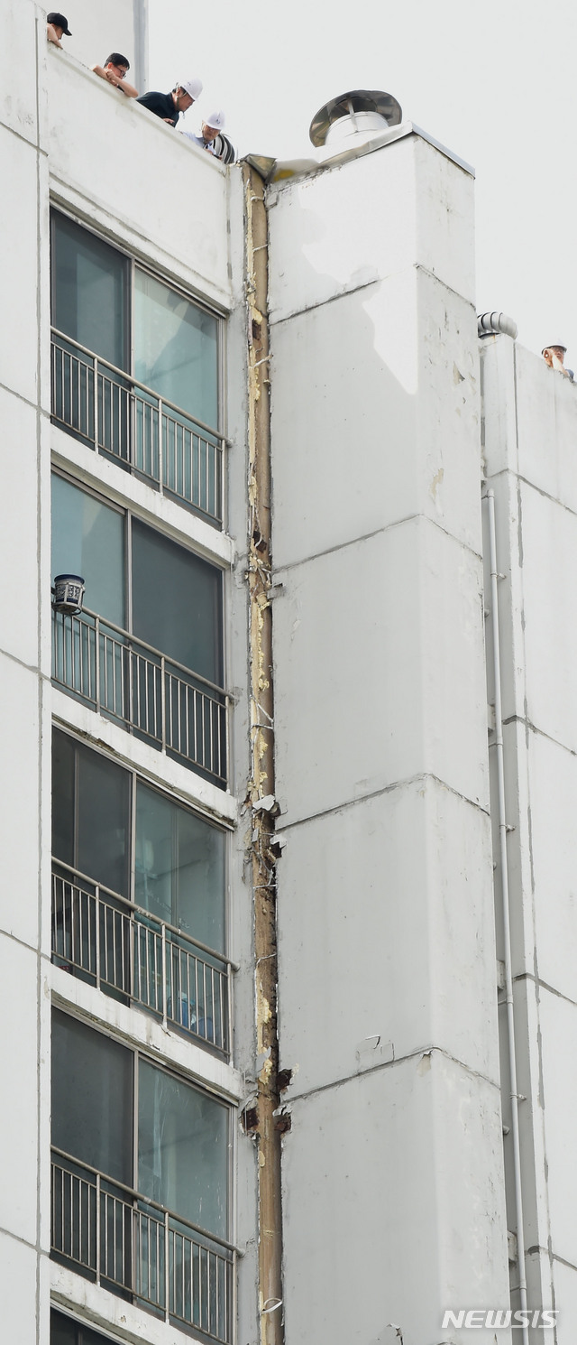 【수원=뉴시스】 김종택 기자 = 19일 오전 경기도 수원시 권선구 구운동 A아파트 15동 외벽에 균열이 발생해 수원시 관계자들이 건축물에 대한 안전진단을 점검하고 있다. 2019.08.19.