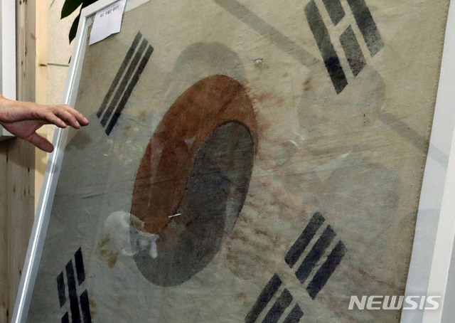 【서울=뉴시스】최동준 기자 = 19일 서울 여의도 광복회 로비에서 열린 항일독립운동사료전시회 '독립 혈전-1' 개막식에서 김원웅 광복회장을 비롯한 참석자들이 전시된 독립군 태극기에 대해 설명을 듣고 있다. 2019.08.19.