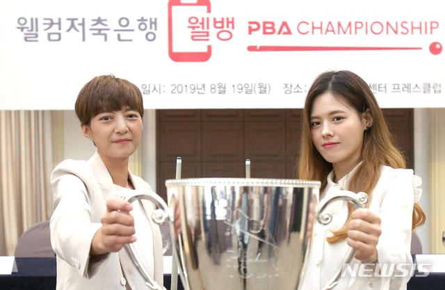 【서울=뉴시스】19일 서울 중구 프레스센터에서 열린 웰컴저축은행 웰뱅 PBA-LPBA 챔피언십 미디어데이에서 임정숙(왼쪽), 서한솔 선수가 포즈를 취하고 있다. 2019.08.19. (사진=PBA투어 제공)