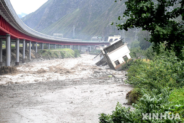 【원촨(중국 쓰촨성)=신화/뉴시스】20일(현지시간) 촬영된 사진에 중국 남서부 쓰촨성 원촨현의 건물이 산사태로 붕괴된 모습이 담겨 있다.