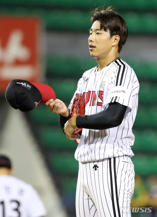 【서울=뉴시스】이영환 기자 = 20일 오후 서울 송파구 잠실야구장에서 열린 2019 KBO리그 LG 트윈스 대 KIA 타이거즈의 경기, 9회초 마운드에 오른 LG 정우영이 경기를 준비하고 있다. 2019.08.20.