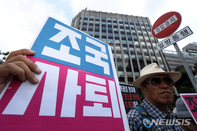 【서울=뉴시스】 이윤청 기자 = 사법시험 존치를 위한 고시생모임이 23일 오전 조국 법무부장관 후보자의 인사청문회 준비 사무실이 위치한 적선현대빌딩 앞에서 기자회견을 열고 조국 후보자 사퇴 및 로스쿨 폐지를 촉구하고 있다. 2019.08.23.