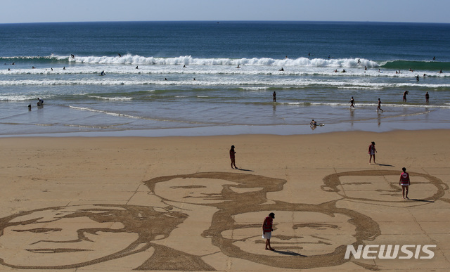 【비아리츠=AP/뉴시스】23일(현지시간) 프랑스 남서부 비아리츠 해변에 예술가 샘 도거도스가 G7 정상의 초상화를 모래에 그려 관광객들이 이를 살펴보고 있다.
