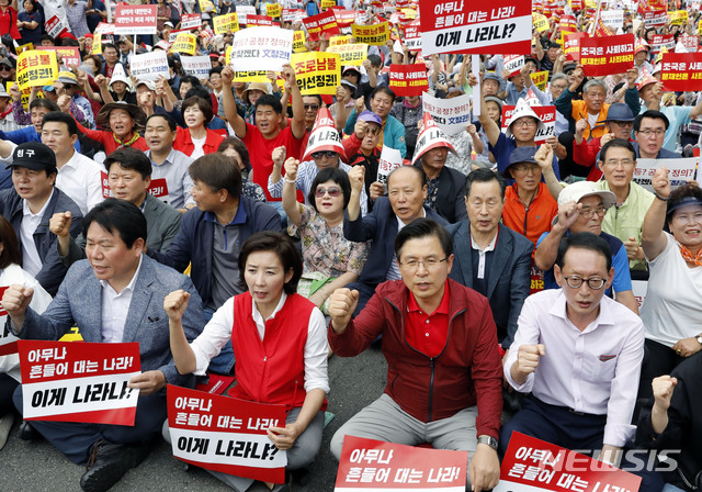 【서울=뉴시스】최동준 기자 = 자유한국당 황교안 대표, 나경원 원내대표 등 자유한국당 의원과 당원 등이 24일 서울 종로구 세종문화회관 앞에서 문재인 정권 국정운영 규탄 집회를 열고 조국 법무부 장관 후보자 지명 철회 등을 촉구하고 있다. 2019.08.24.