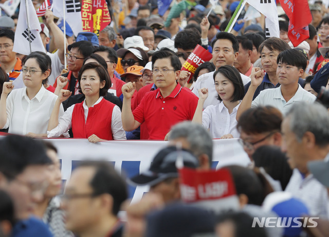 【서울=뉴시스】최동준 기자 = 자유한국당 황교안 대표, 나경원 원내대표 등 자유한국당 의원과 당원 등이 24일 서울 종로구 세종문화회관 앞에서 문재인 정권 국정운영 규탄 집회를 가진 뒤 청와대를 향해 행진하고 있다. 2019.08.24.