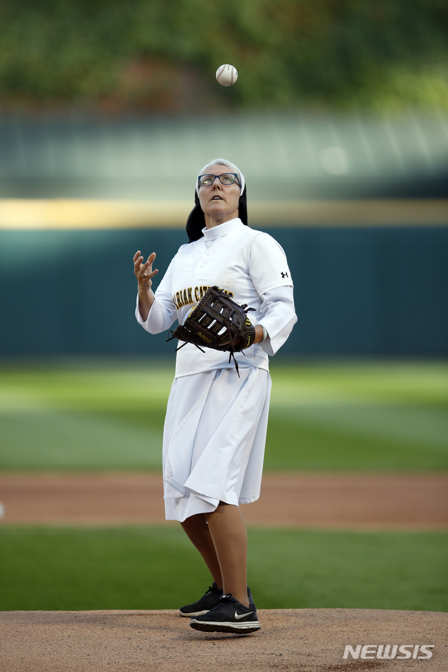 【시카고=AP/뉴시스】미 마리아 가톨릭 고교 교사인 마리아 조 소벡(Mary Jo Sobeck) 수녀가 24일(현지시간) 미 일리노이주 시카고의 개런티드 레이트 필드에서 열린 2019 메이저리그 텍사스 레인저스와 시카고 화이트삭스의 경기에 앞서 시구에 나서 공을 머리 위로 튕겨보고 있다.