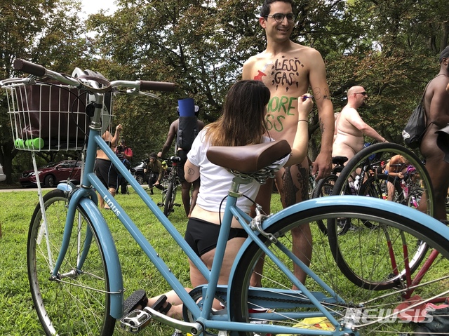 【필라델피아=AP/뉴시스】누드로 자전거를 타는 오렌 로스 아이젠버그가 24일(현지시간) 미 펜실베이니아주 필라델피아에서 열린 '필리 누드 자전거 경주'에 참여한 가운데 부인이 그의 몸에 화석연료 사용에 반대하는 글귀를 쓰고 있다. 2019.08.25.