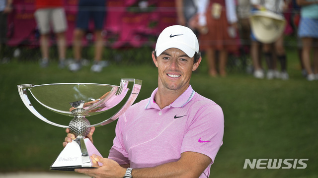 【애틀랜타=AP/뉴시스】로리 맥길로이(북아일랜드)가 25일(현지시간) 미 조지아주 애틀랜타의 이스트 레이크 골프클럽에서 막을 내린 PGA 투어 페덱스컵 플레이오프 최종전 투어 챔피언십에서 우승 후 트로피를 들고 포즈를 취하고 있다.