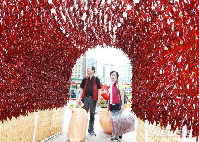 【영양=뉴시스】 김진호 기자 = 26일 '2019 경북 영양고추 H.O.T 페스티벌'이 열리고 있는 서울시청 광장에 고추터널이 꾸며졌다.