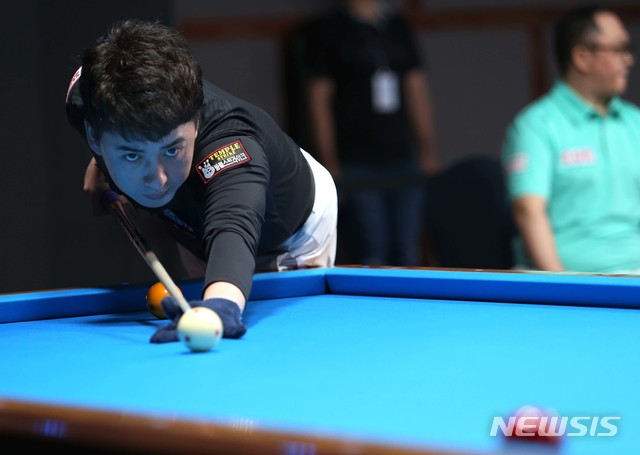 【서울=뉴시스】26일 경기도 고양시 일산 엠블호텔에서 열린 프로당구 PBA 투어 3차전 '웰컴저축은행 웰뱅 PBA-LPBA 챔피언십' 경기에서 김기혁이 경기에 임하고 있다. 2019.08.27. (사진=PBA 투어 제공)