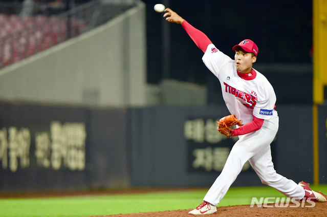 【광주=뉴시스】류형근 기자 = 27일 오후 광주 북구 광주-기아챔피언스필드에서 열린 2019프로야구 KIA 타이거즈 대 삼성 라이온스의 경기, 9회초 2사 1, 3루 상황에서 등판한 KIA 바뀐투수 양승철이 역투하고 있다. 2019.08.27.