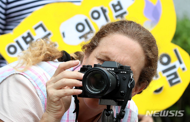 【서울=뉴시스】추상철 기자 =일본군성노예제 문제 해결을 위한 '제1402차 정기 수요시위'가 열린 28일 오후 서울 종로구 구 일본대사관 앞에서 외국인 참가자가 수요시위를 카메라에 담고 있다. 2019.08.28.
