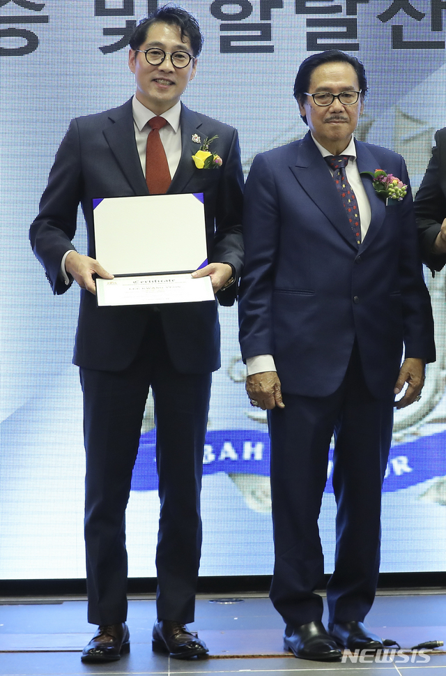 【서울=뉴시스】최진석 기자 =  28일 오후 서울 여의도 씨티클럽 컨벤션홀에서 열린 인도네시아 상공회의소 한국대표부 출범식 할랄인증 및 할랄산업정책 발표회에서 존니 와아스(오른쪽) 인도네시아 상공회의소 OKK 부의장이 이광연 인도네시아 상공회의소 한국대표부 대표에게 임명장을 수여 뒤 기념촬영 하고 있다. 2019.08.28.