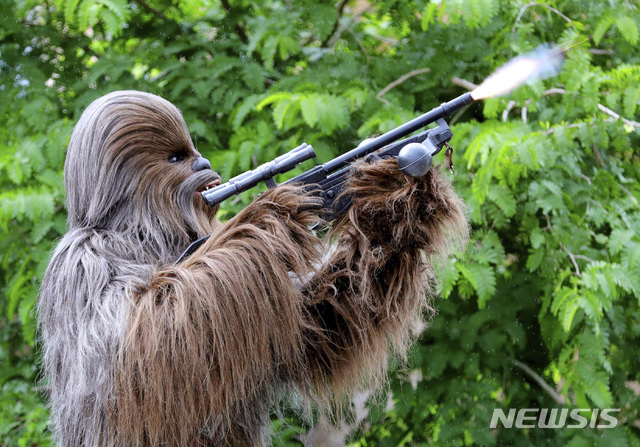 【레이크부에나비스타=AP/뉴시스】28일(현지시간) 미 플로리다주 레이크 부에나비스타의 디즈니 할리우드 스튜디오에서 스타워즈 테마파크 '스타워즈: 갤럭시 엣지'가 개장해 츄바카등 영화 속 캐릭터들이 공연하고 있다. 2019.08.29.