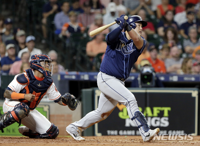 【휴스턴=AP/뉴시스】탬파베이 레이스의 최지만이 28일(현지시간) 미 텍사스주 휴스턴 미닛메이드파크에서 열린 2019 메이저리그 휴스턴 애스트로스와의 경기에서 4회 2점 홈런을 치고 있다.