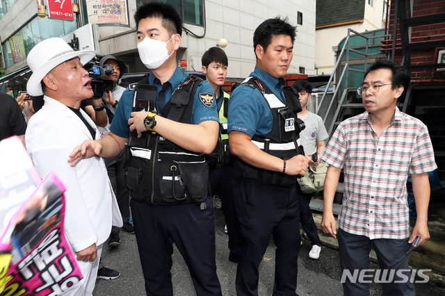 경찰 관계자는 이날 애국국민운동대연합이 집회 신고를 하지 않은 채 기자회견을 시작했다고 밝혔다. 2019.08.29.