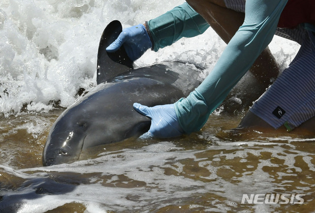 【하와이=AP/뉴시스】29일(현지시간) 하와이 마우이섬 키헤이 해안 휴양지의 슈거 비치에서 고양이고래(멜론머리고래) 10마리가 이른 아침부터 육지로 올라왔다. 사진은 현장에서 사람에 의해 구조되고 있는 고래의 모습. 미국 해양대기청(NOAA)은 상태가 심각한 고래 4명을 안락사시켰다. 2019.08.30.