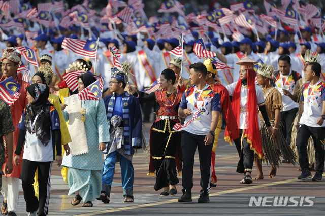 【푸트라자야(말레이시아)=AP/뉴시스】31일(현지시간) 말레이시아 푸트라자야에서 제62주년 독립기념일 행사가 열려 전통 의상을 입은 시민들이 행진하고 있다. 말레이시아는 1957년 8월 31일 영국으로부터 독립했다. 2019.08.31.