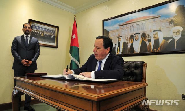 【암만(요르단)=뉴시스】 채정병 기자 = 9일(현지시간) 카미스 주하이나위 튀니지 외무장관이 요르단 외무부를 방문, 아이만 사파디 요르단 외무장관과 양국협력 및 지역문제에 관해 회담했다.