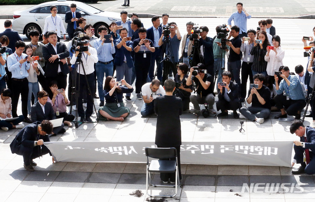 【서울=뉴시스】이종철 기자 = 무소속 이언주 의원이 10일 서울 여의도 국회 본청 계단앞에서 조국 법무부장관 임명을 규탄하는 삭발을 한뒤 기자회견을 하고 있다. 2019.09.10.