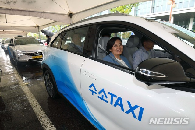 【서울=뉴시스】박영태 기자 = 10일 서울 여의도 국회에서 열린 수소차 충전소 개소식에 참석한 박영선 중소벤처기업부 장관이 수소택시를 시승하고 있다.