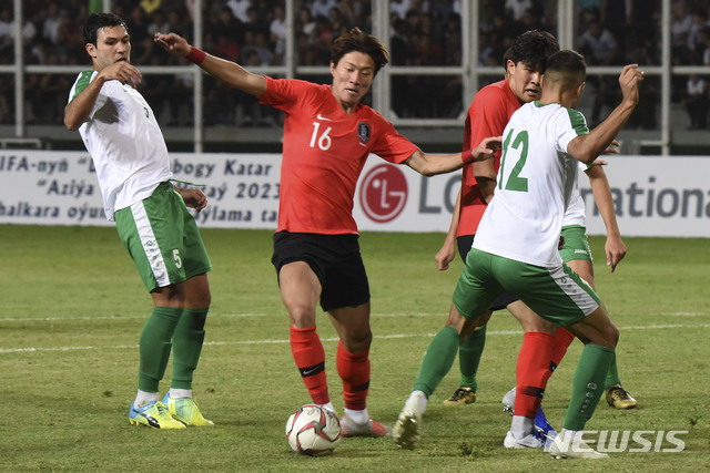 한국은 전반 13분 나상호의 선제골과 후반 37분 정우영의 프리킥 추가 골로 투르크메니스탄에 2-0 승리를 거뒀다. 2019.09.11.