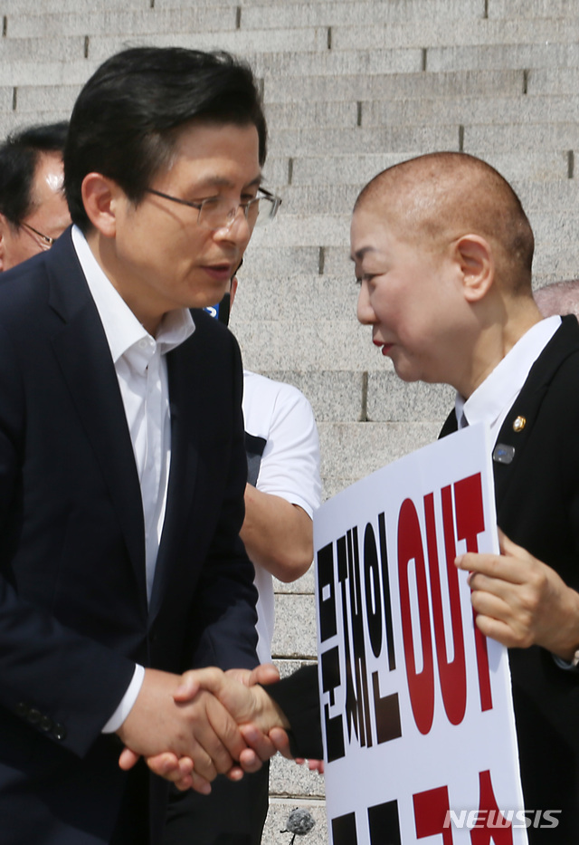 【서울=뉴시스】이종철 기자 = 11일 서울 여의도 국회 본관 앞 계단 밑에서 자유한국당 황교안 대표가 조국 법무부장관 임명 철회를 요구하며 삭발을 한 박인숙 의원을 격려하고 있다. 2019.09.11.