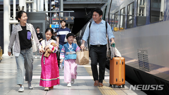 【서울=뉴시스】홍효식 기자 = 추석연휴를 하루 앞둔 11일 서울역에서 한복을 입은 어린이와 함께 한가족이 열차에 오르기 위해 발걸음을 옮기고 있다. 2019.09.11.