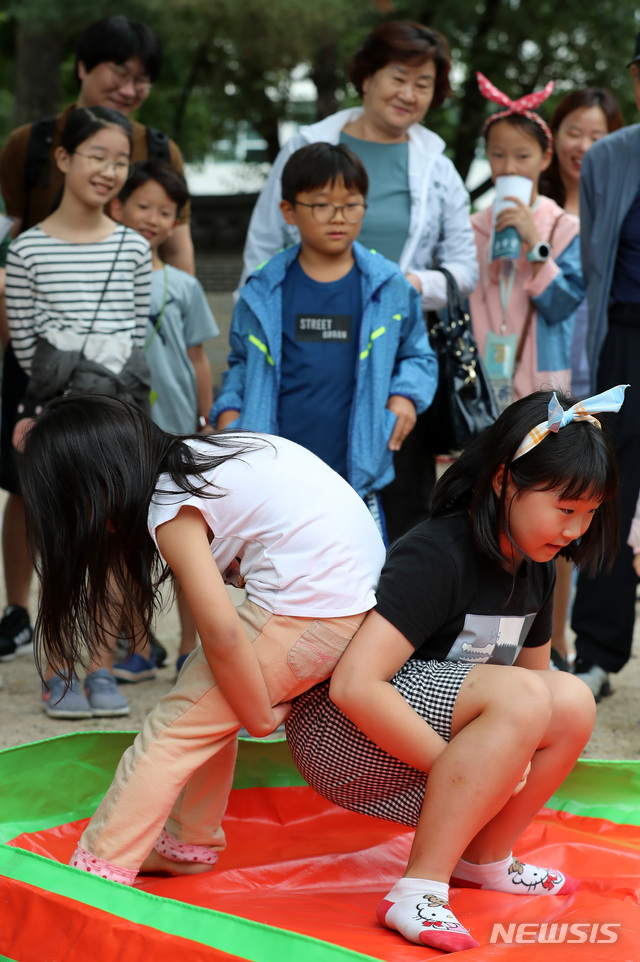 【서울=뉴시스】이영환 기자 = 추석 연휴 첫날인 12일 오후 서울 종로구 운현궁에서 열린 한가위 민속한마당에서 어린이들이 돼지 씨름을 즐기고 있다.
