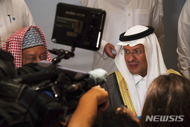 【아부다비=AP/뉴시스】사우디아라비아 에너지 장관인 압둘아지즈 빈살만 왕자가 12일(현지시간) 아랍에미리트연합(UAE) 아부다비에서 열린 OPEC+ 장관급감시위원회(JMMC) 회의가 끝난 후 기자들의 질문에 답하고 있다. 그는 오는 12월 오스트리아 빈에서 열릴 OPEC+ 회의에서 감산량을 늘리는 방안이 논의될 것이라고 말했다. 2019.09.13