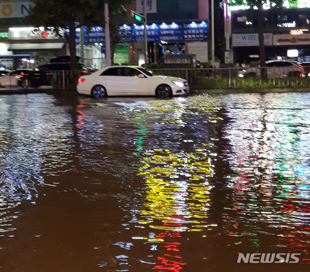 【수원=뉴시스】 김종택 기자 = 13일 오후 경기도 안양시 동안구 인덕원역 사거리에서 광역상수관 파열로 도로가 침수돼 있다. 2019.09.14.(사진=독자 조혜정씨 제공)