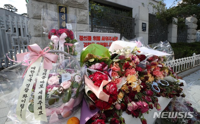 사진은 15일 오후 서울 서초구 대검찰청 앞에 검찰을 응원하는 꽃다발들이 놓여 있다. 2019.09.15.