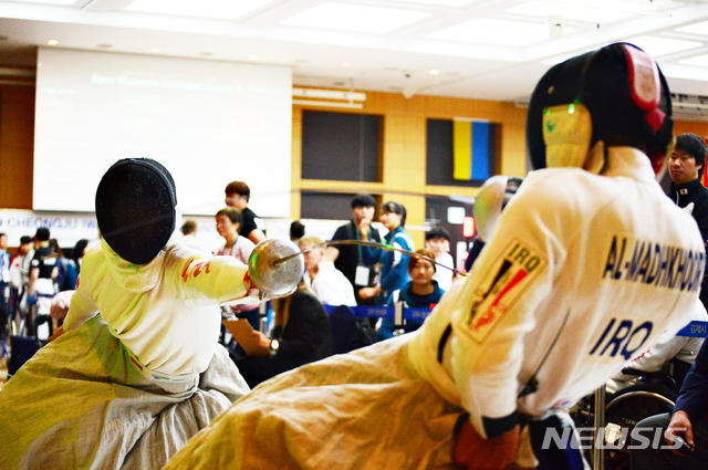 【청주=뉴시스】 인진연 기자 = 17일 충북 청주 그랜드플라자 호텔 특설경기장에서 개막한 8회 세계휠체어펜싱 선수권대회에 참가한 선수들이 기량을 겨루고 있다. 아시아에서 처음으로 열린 이번 대회는 플뢰레, 에페, 사브르 3개 종목, 2개 부문(단체전·개인전), 3개 등급(허리사용·허리미사용·허리와 손 미사용)으로 나눠 총 22개 세부종목으로 진행한다. 2019.09.17.