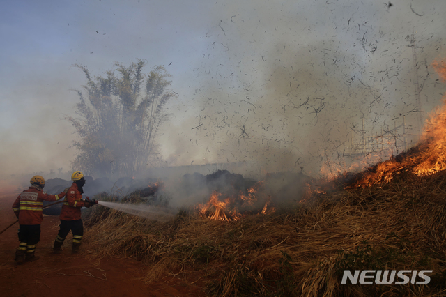 【브라질리아=AP/뉴시스】17일(현지시간) 브라질 수도 브라질리아에서 20km 떨어진 자르징 망게이라우 인근 사바나 지역에서 불이 나 소방관들이 불을 끄기 위해 대응하고 있다.