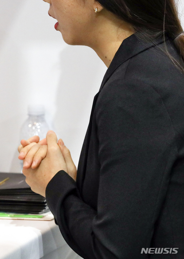 【서울=뉴시스】최진석 기자 = 19일 오후 서울 성동구 한양대학교 올림픽체육관에서 열린 '2019 청년 과학기술인 일자리 박람회'를 찾은 한 취업준비생이 면접을 보며 두 손을 모으고 있다. 2019.09.19.