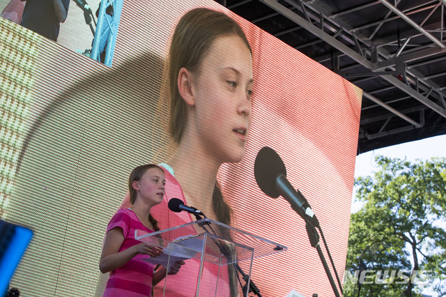 【뉴욕=AP/뉴시스】스웨덴의 10대 환경운동가 그레타 툰베리가 20일(현지시간) 미국 뉴욕에서 열린 '글로벌 기후 파업'에 참석해 연설하고 있다.