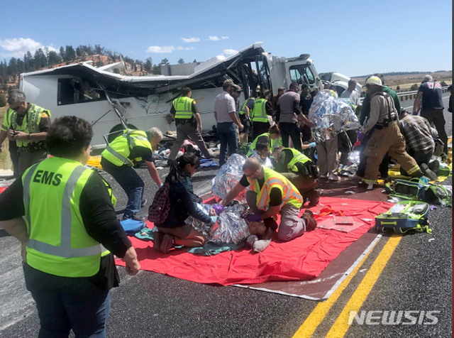 【브라이스캐니언=AP/뉴시스】20일(현지시간) 미 유타주 브라이스캐니언 국립공원 부근 도로에서 중국인으로 보이는 단체 관광객 탑승 버스가 가드레일을 들이받는 사고가 나 긴급구조대가 대응하고 있다.