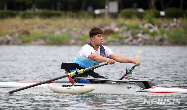 【하남=뉴시스】김선웅 기자 = 지난 2015년 북한의 목함지뢰 도발로 두 다리를 잃고 장애인조정선수로 제2의 인생을 시작한 하재헌 전 육군 중사가 21일 오전 경기 하남시 미사리 조정경기장에서 열린 서울시장배 장애인조정경기대회에 참가해 경기를 펼치고 있다. 2019.09.21.