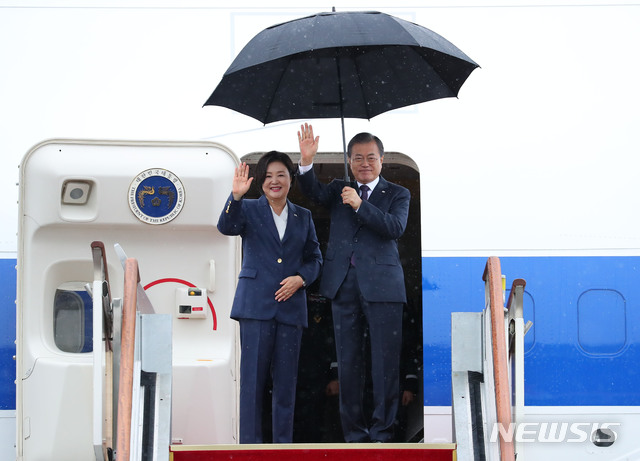 【성남=뉴시스】전신 기자 = 유엔총회 참석과 한·미 정상회담 등을 위해 미국 뉴욕을 3박5일 일정으로 방문하는 문재인 대통령과 부인 김정숙 여사가 22일 경기도 성남 서울공항에서 공군1호기 탑승 전 손 흔들어 인사하고 있다. 2019.09.22.
