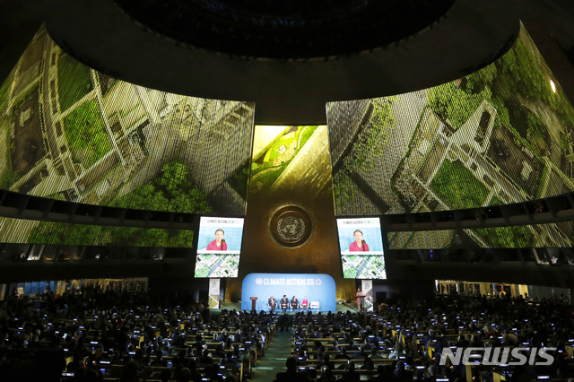 【뉴욕=AP/뉴시스】스웨덴의 16세 소녀 환경운동가 그레타 툰베리가 23일(현지시간) 미국 뉴욕의 유엔본부에서 열린 기후행동정상회의에서 연설하고 있다.