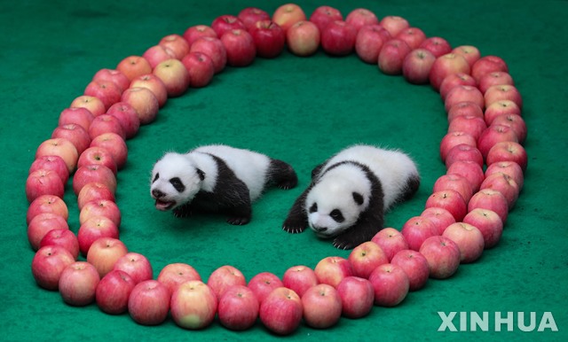 【청두=신화/뉴시스】24일(현지시간) 중국 쓰촨성 성도 청두의 자이언트 판다 사육 연구기지에서 새끼 자이언트 판다 두 마리가 사과에 둘러싸여 있다.