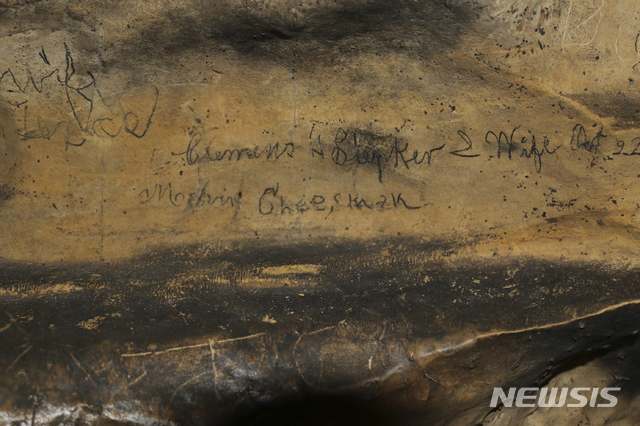 【해니벌=AP/뉴시스】지난 7월 26일 자 사진에 '톰 소여의 모험' 작가 마크 트웨인(본명: 새뮤얼 랭그혼 클레먼스)의 어린 시절 고향 집인 미 미주리주 해니벌의 마크 트웨인 동굴 벽에 '클레먼스'라는 서명이 보인다.
