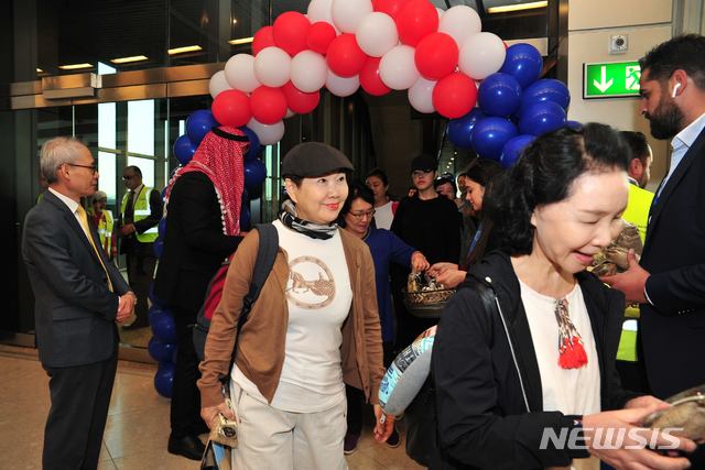 【암만(요르단)=뉴시스】 채정병 기자 = 27일(현지시간) 인천-암만을 잇는 최초의 대한항공 직항 전세기가 179명의 관광객을 태우고 요르단 퀸알리아 국제공항에 도착한 가운데 승객들이 비행기에서 나오고 있다.