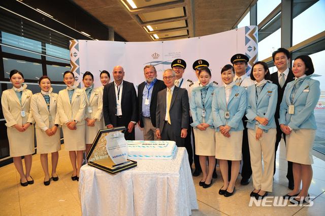 요르단 첫 직항 전세기 취항 기념하는 승무원들