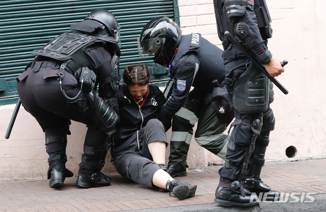 【키토(에콰도르)=AP/뉴시스】3일(현지시간) 에콰도르 수도 키토에서 경찰이 시위 중인 한 여성을 체포하고 있다.