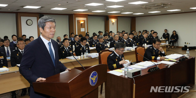 【서울=뉴시스】 고범준 기자 = 4일 오후 서울 서대문구 경찰청에서 열린 국회 행정안전위원회(행안위) 경찰청 국정감사에서 이세민 전 경무관이 질의에 답변하고 있다. 2019.10.04.
