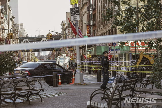 【뉴욕=AP/뉴시스】5일 새벽(현지시간) 미국 뉴욕 차이나타운 일대에서 노숙자 한 명이 다른 노숙자들을 살해한 사건이 일어나 현장에서 경찰이 수사하고 있다.