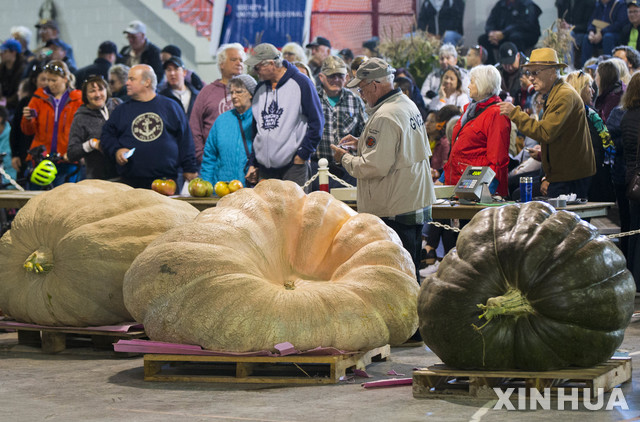 【브루스카운티(캐나다)=신화/뉴시스】5일(현지시간) 캐나다 온타리오주 브루스 카운티에서 '2019 포트 엘긴 호박축제'가 열려 관람객들이 호박 경연대회 출품 호박들을 살펴보고 있다. 2019.10.06.