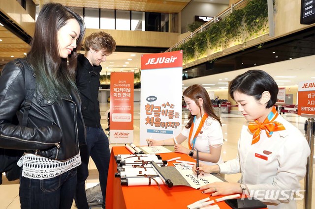 【서울=뉴시스】7일 제주항공 승무원들이 서울 강서구 김포공항 국제선 2층 카운터에서 한글날을 앞두고 외국인 여행객들에게 한글 이름을 써주는 손글씨 행사를 진행하고 있다. 2019.10.07. (사진=제주항공 제공)